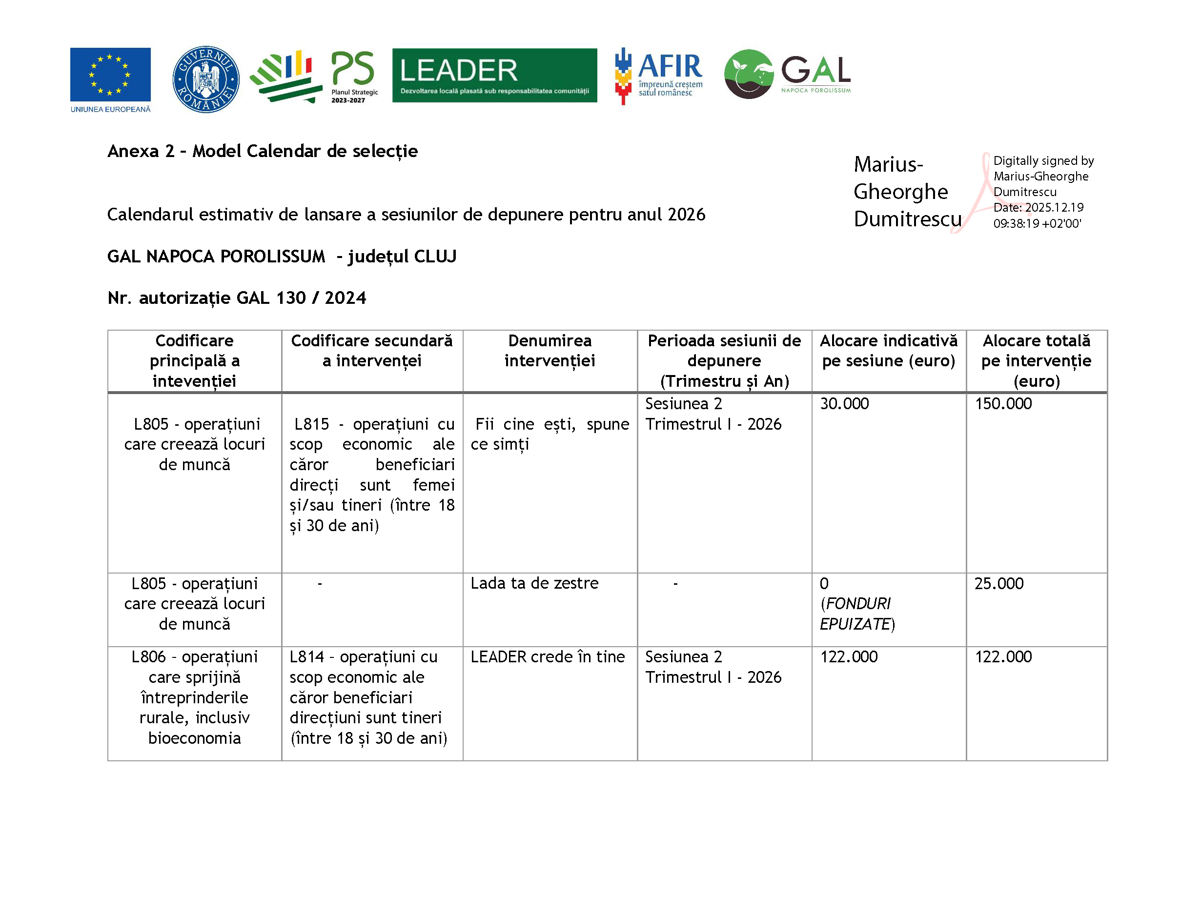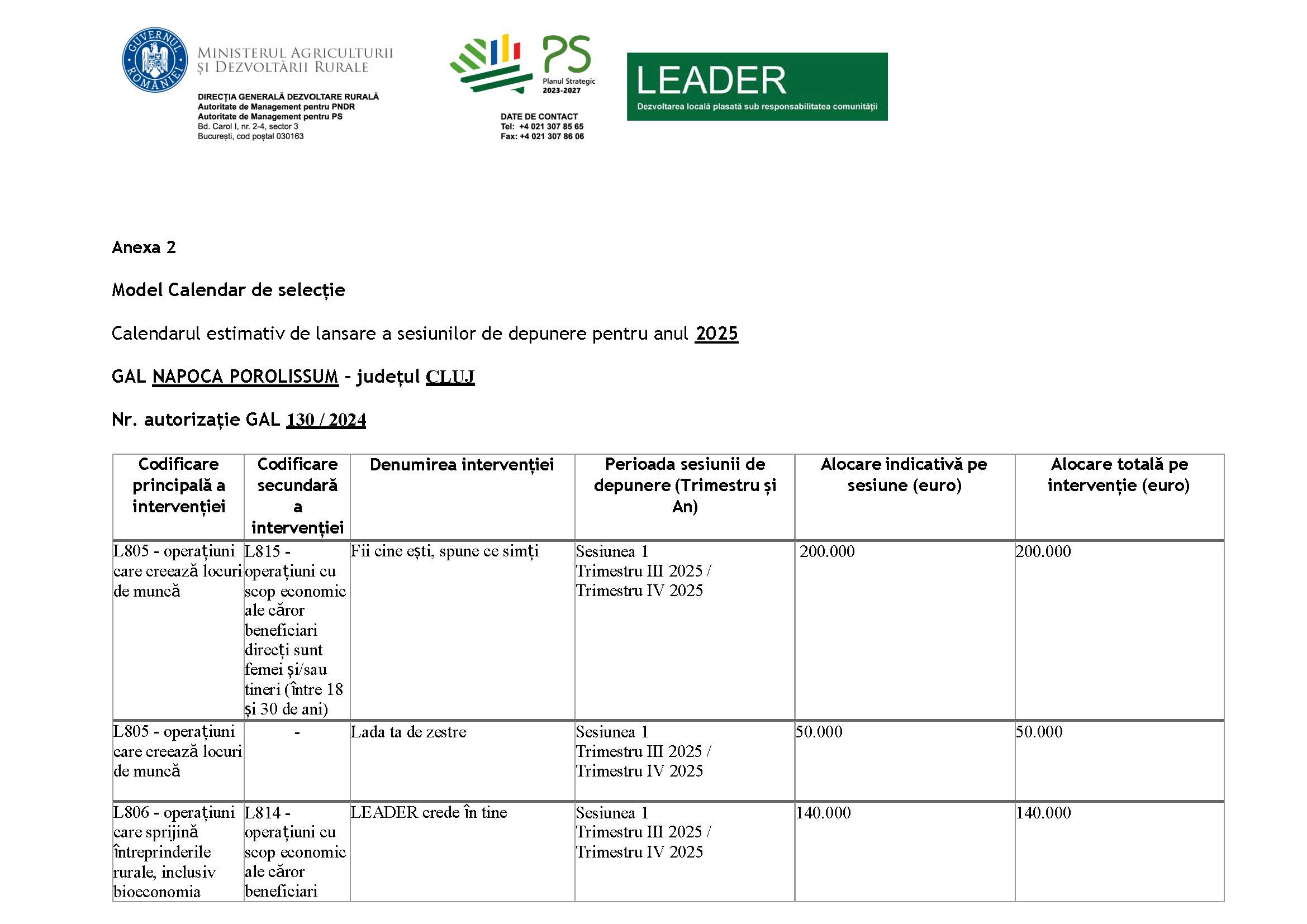 Documentul cuprinde informații despre sesiunile planificate de depunere, alocările financiare și tipurile de intervenții sprijinite în teritoriul GAL Napoca Porolissum. Pregătim o perioadă activă, cu numeroase oportunități pentru inițiative locale.
