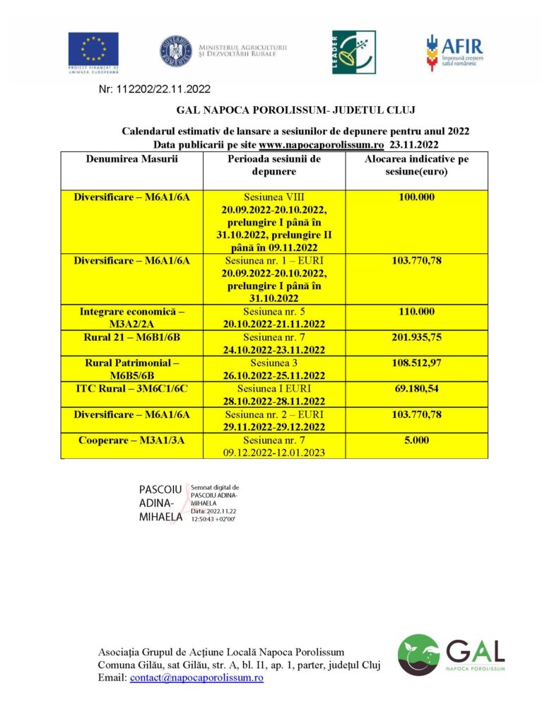 Calendar estimativ lansare sesiuni de depunere pentru anul 2022 – publicat 23.11.2022